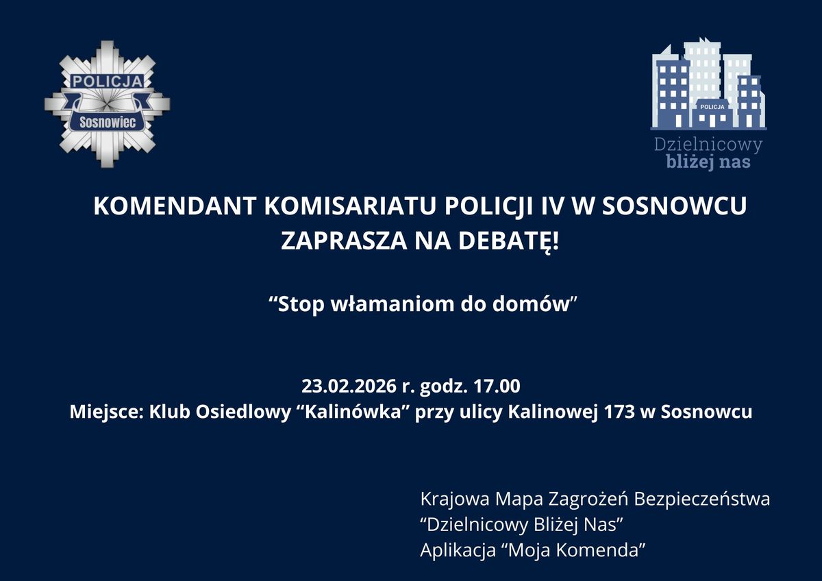 Komendant Komisariatu Policji IV w Sosnowcu serdecznie zaprasza mieszkańców na debatę społeczną poświęconą bezpieczeństwu w miejscu zamieszkania. Spotkanie odbędzie się 23 lutego 2026 roku o godzinie 17:00 w Klub Osiedlowy Kalinówka przy ulicy Kalinowej 173 w Sosnowcu. Celem wydarzenia jest rozmowa z mieszkańcami na temat kradzieży z włamaniem do mieszkań, zagrożeń występujących w rejonie ich miejsca zamieszkania oraz wspólne wypracowanie rozwiązań poprawiających poziom bezpieczeństwa.